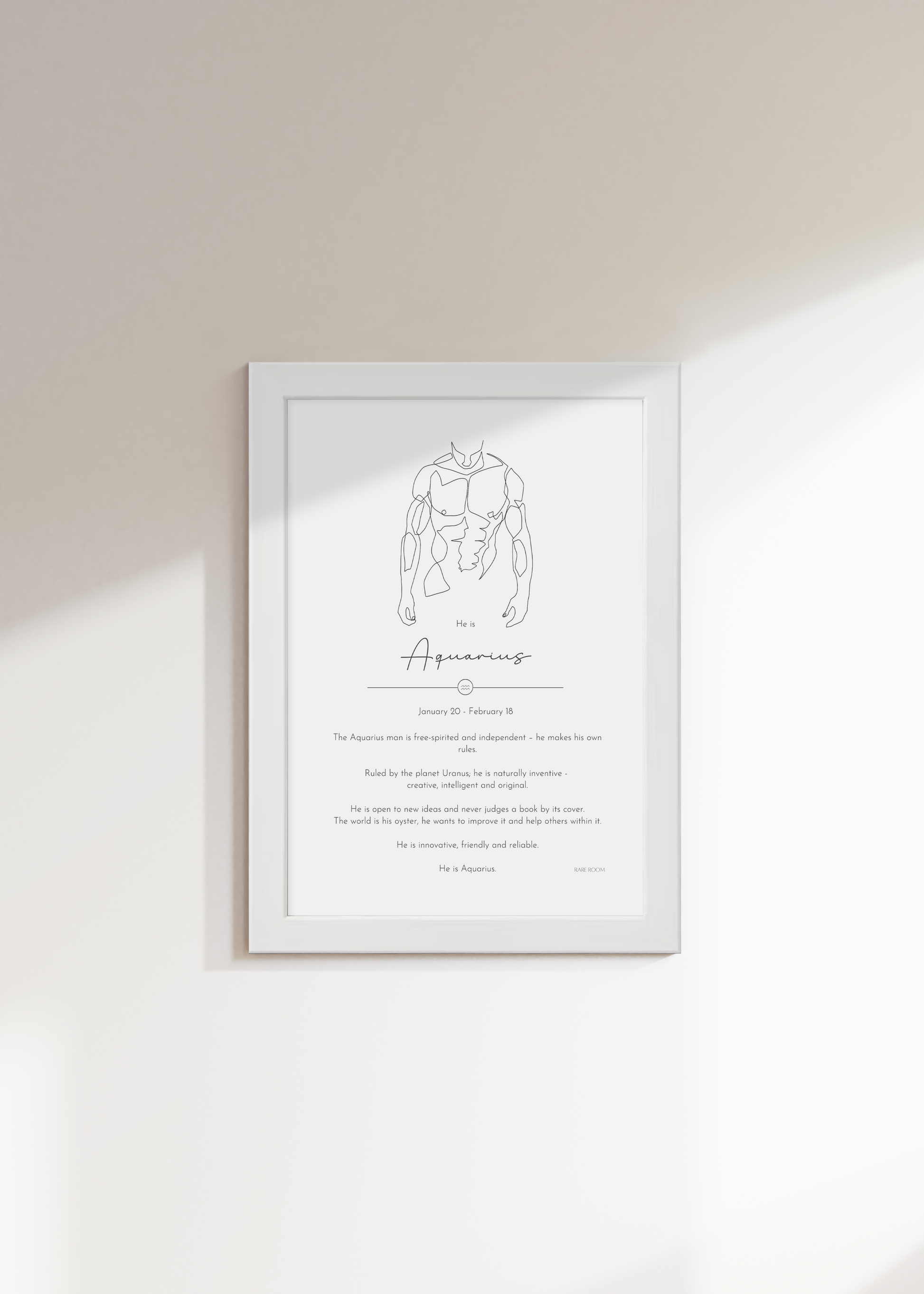 Shop our 'He is Aquarius' framed print, perfect for you or a loved one born between January 20 and February 18—celebrating the originality, independence, and innovative spirit of an Aquarius.