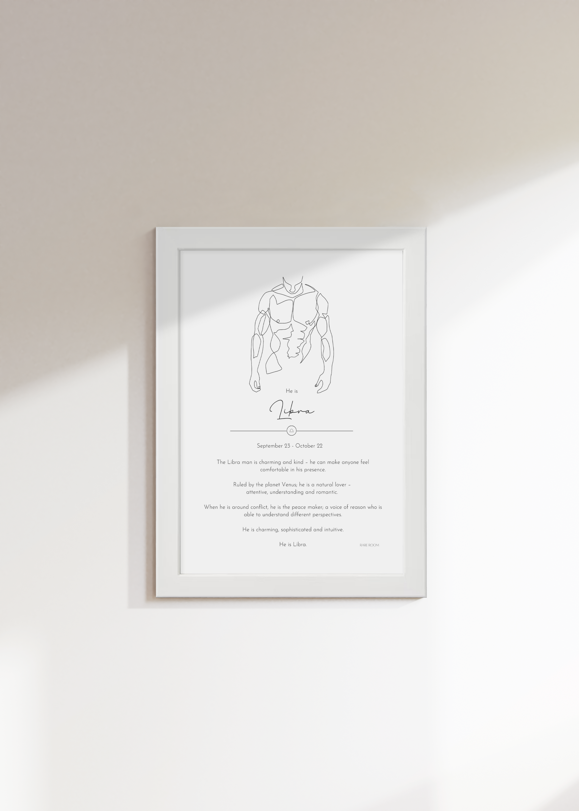 Shop our 'He is Libra' framed print, perfect for you or a loved one born between September 23 and October 22—celebrating the balance, harmony, and charm of a Libra.