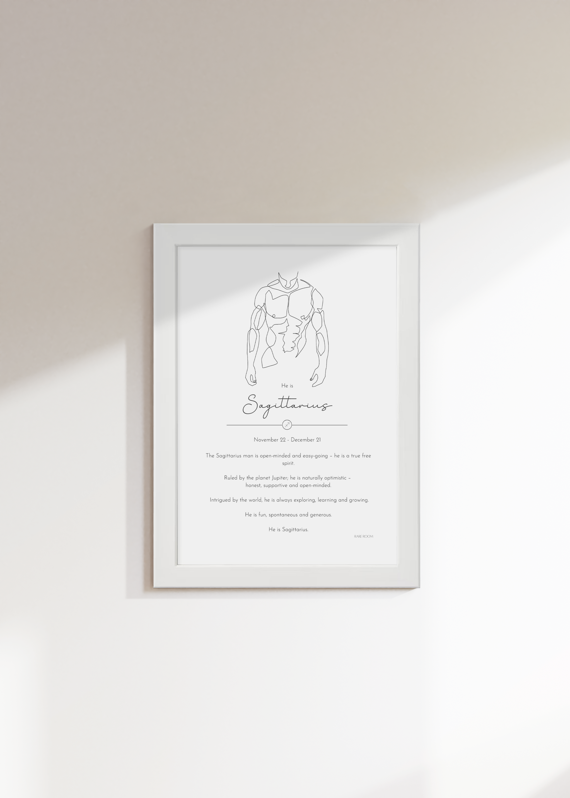 Shop our 'He is Sagittarius' framed print, perfect for you or a loved one born between November 22 and December 21—celebrating the adventurous, optimistic, and free-spirited nature of a Sagittarius.