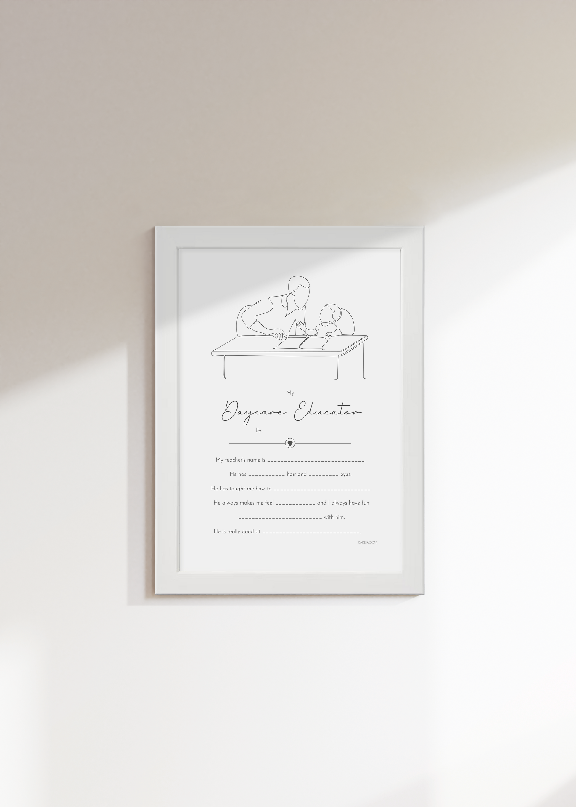 Shop our 'My Daycare Educator' framed print, a fun and heartfelt keepsake where your child can fill in the blanks with all the special details about their daycare educator—a meaningful gift that captures the unique bond and appreciation they share.