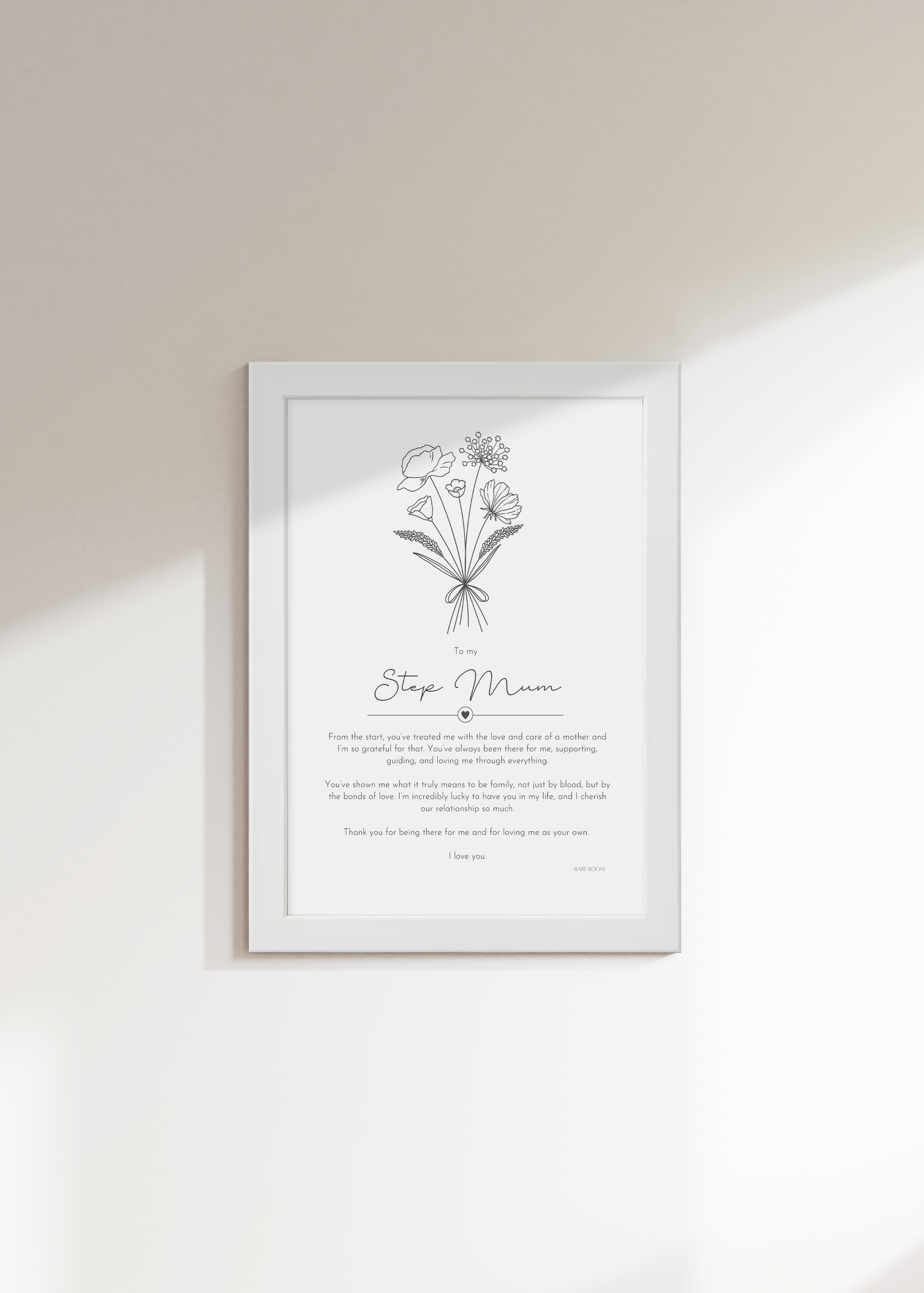 Shop our 'To My Step Mum' framed print, a heartfelt tribute to the love, care, and support she brings—a beautiful reminder of the special place she holds in your heart.