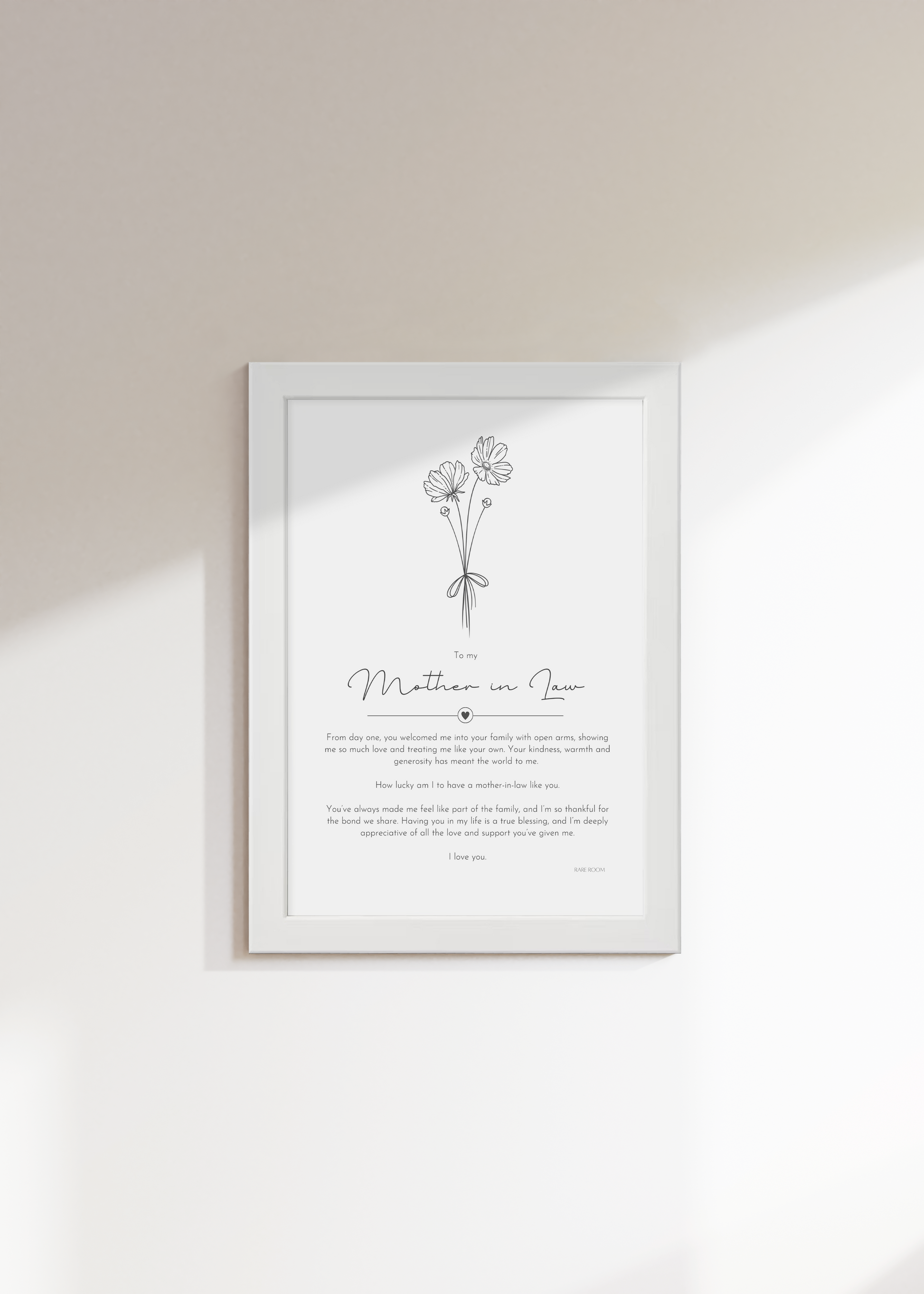 Shop our 'To My Mother in Law' framed print, a heartfelt expression of gratitude for her warmth, guidance, and kindness—a beautiful reminder of the special bond you share.