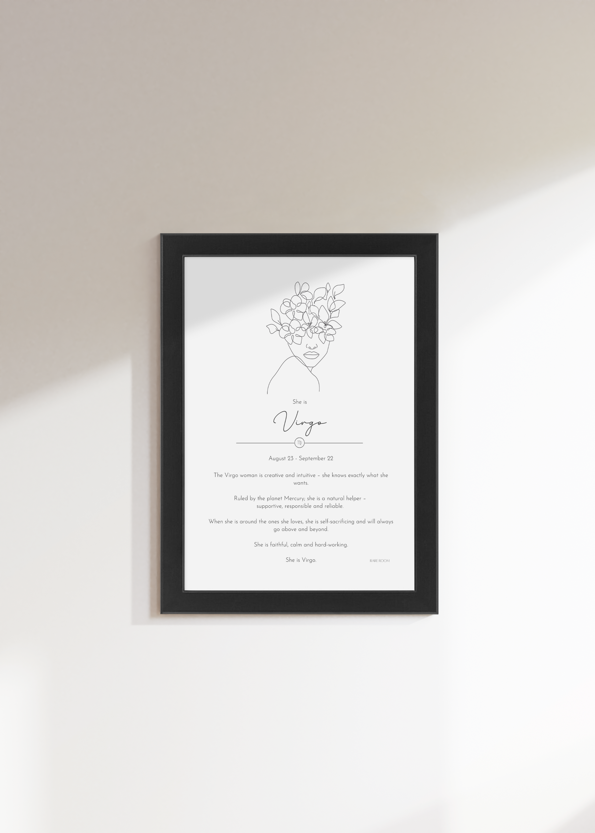Shop our 'She is Virgo' framed print, perfect for you or a loved one born between August 23 and September 22—celebrating the intelligence, precision, and thoughtful nature of a Virgo.