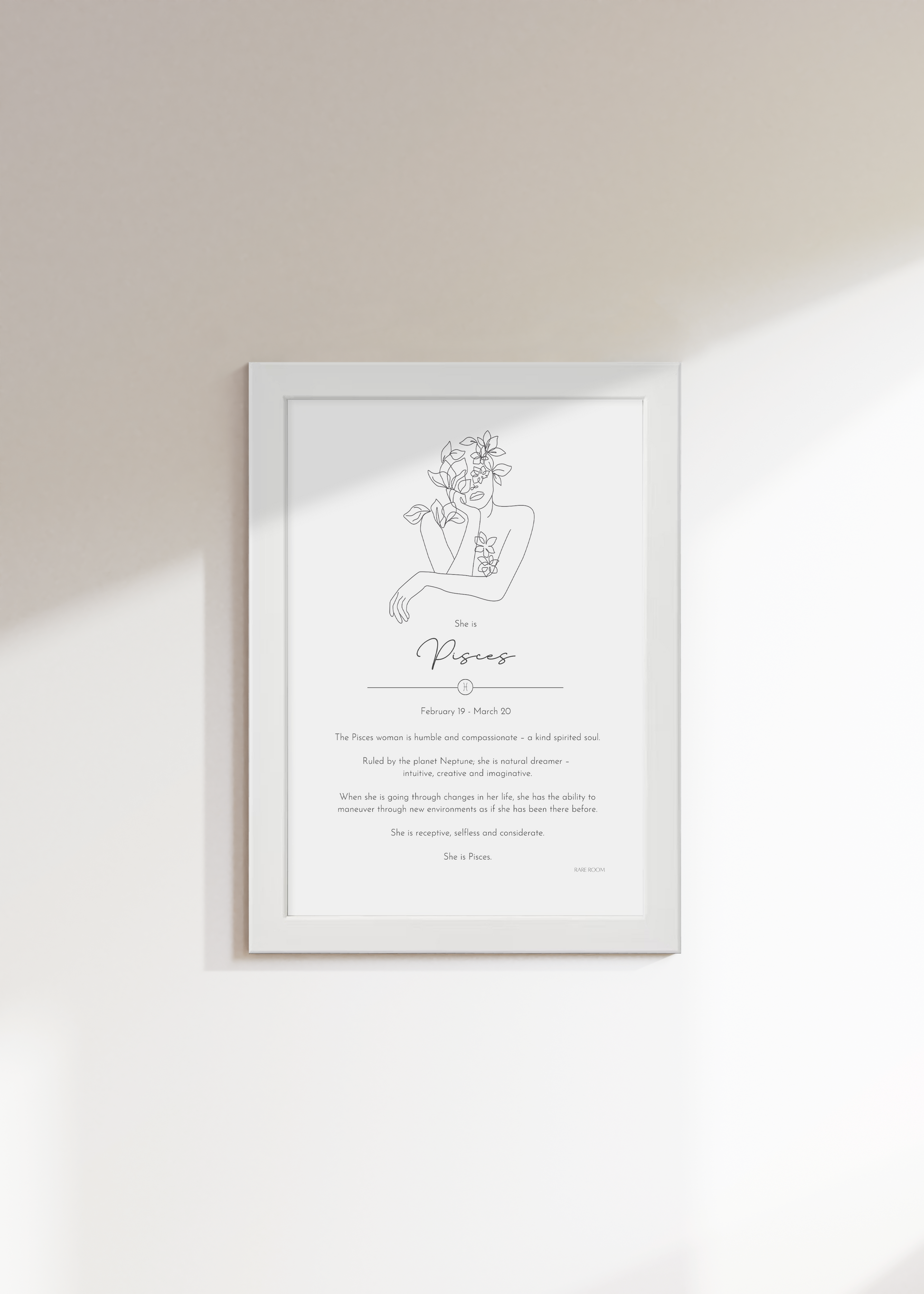Shop our 'She is Pisces' framed print, perfect for you or a loved one born between February 19 and March 20—celebrating the compassion, creativity, and intuitive nature of a Pisces.