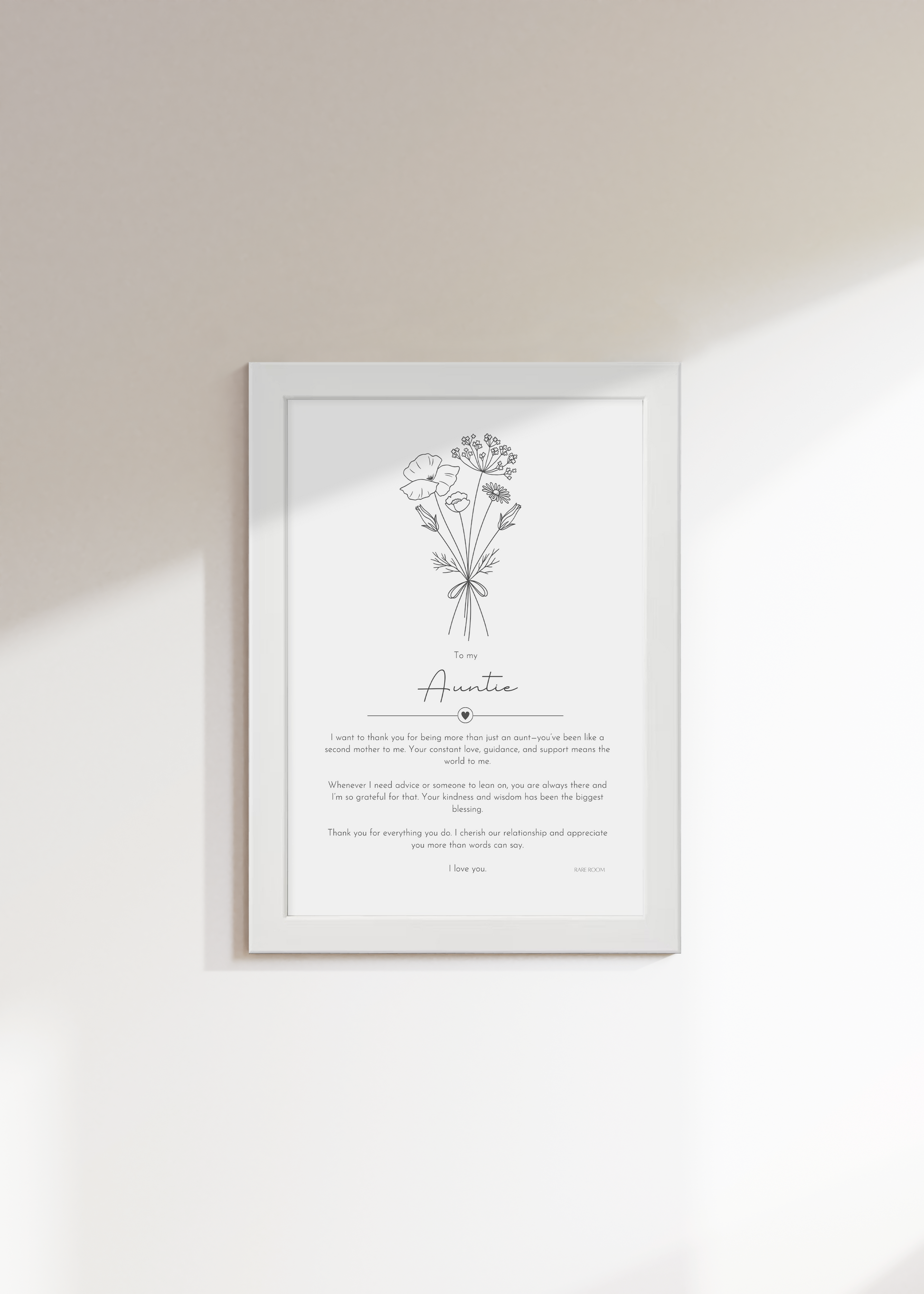 Shop our 'To my Auntie' framed print, a heartfelt tribute to her love, laughter, and unwavering support—a beautiful reminder of the special bond you share.