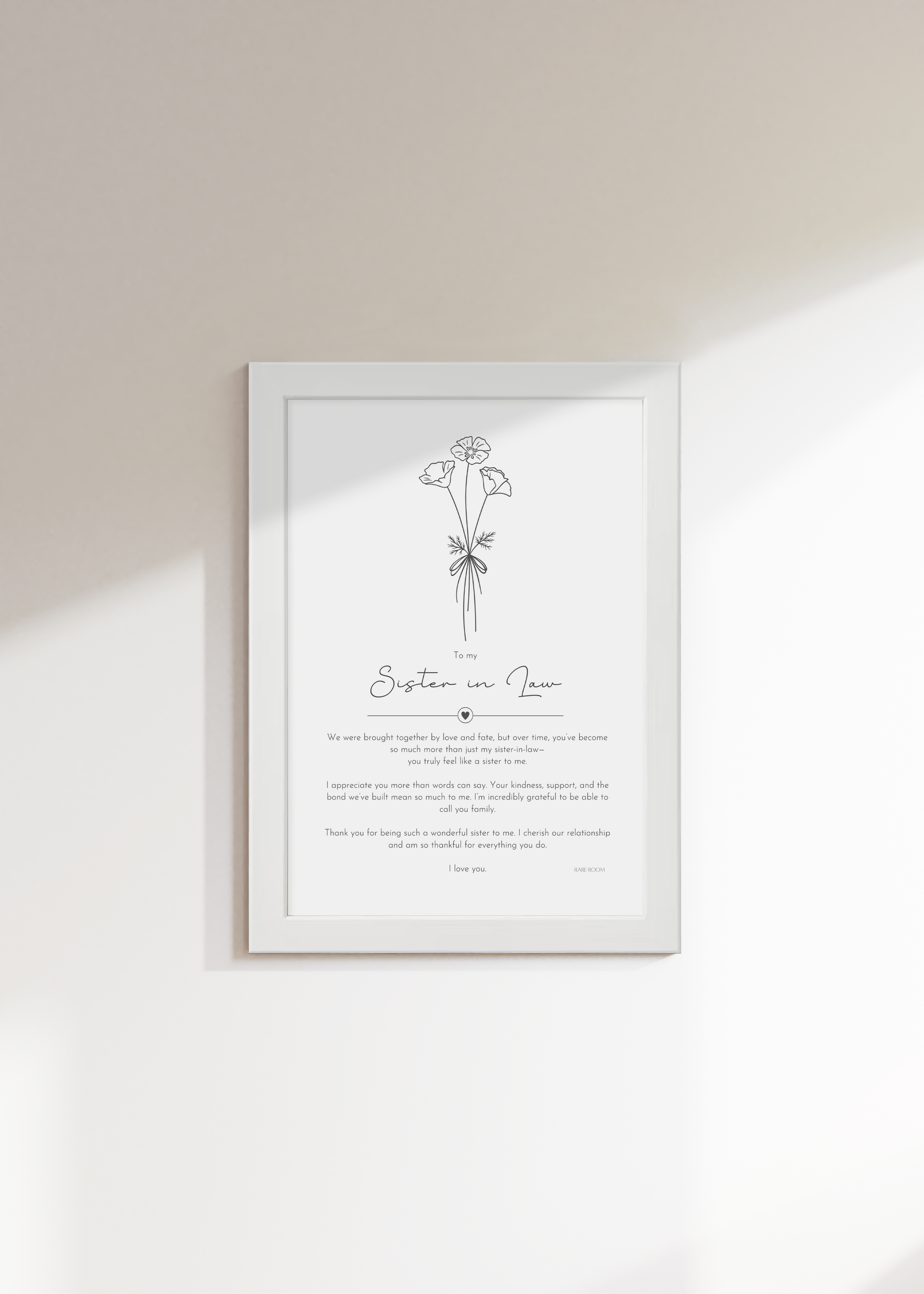 Shop our 'To My Sister in Law' framed print, a beautiful reminder of the friendship, love, and special moments you share—a heartfelt tribute to the incredible bond between you.