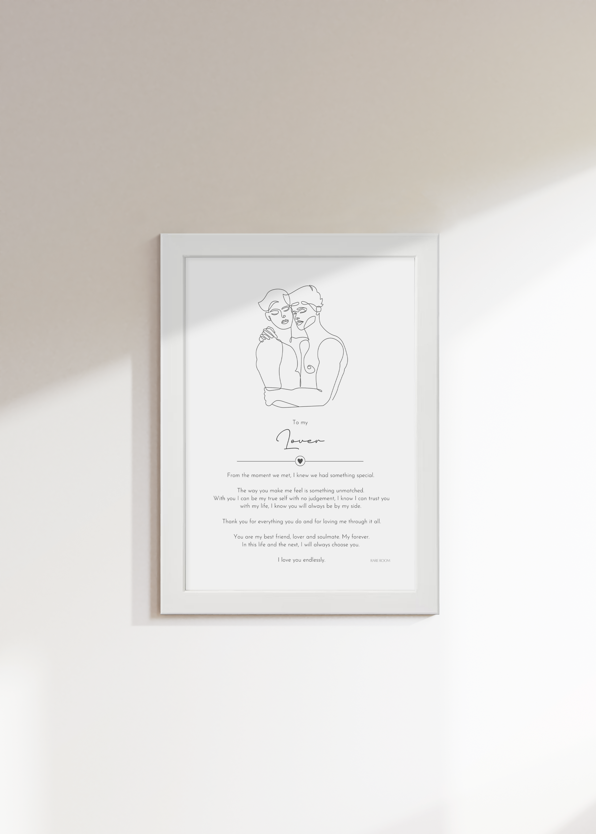 Shop our 'To My Lover' framed print, a heartfelt expression of love and connection—a beautiful reminder of the special bond you share.